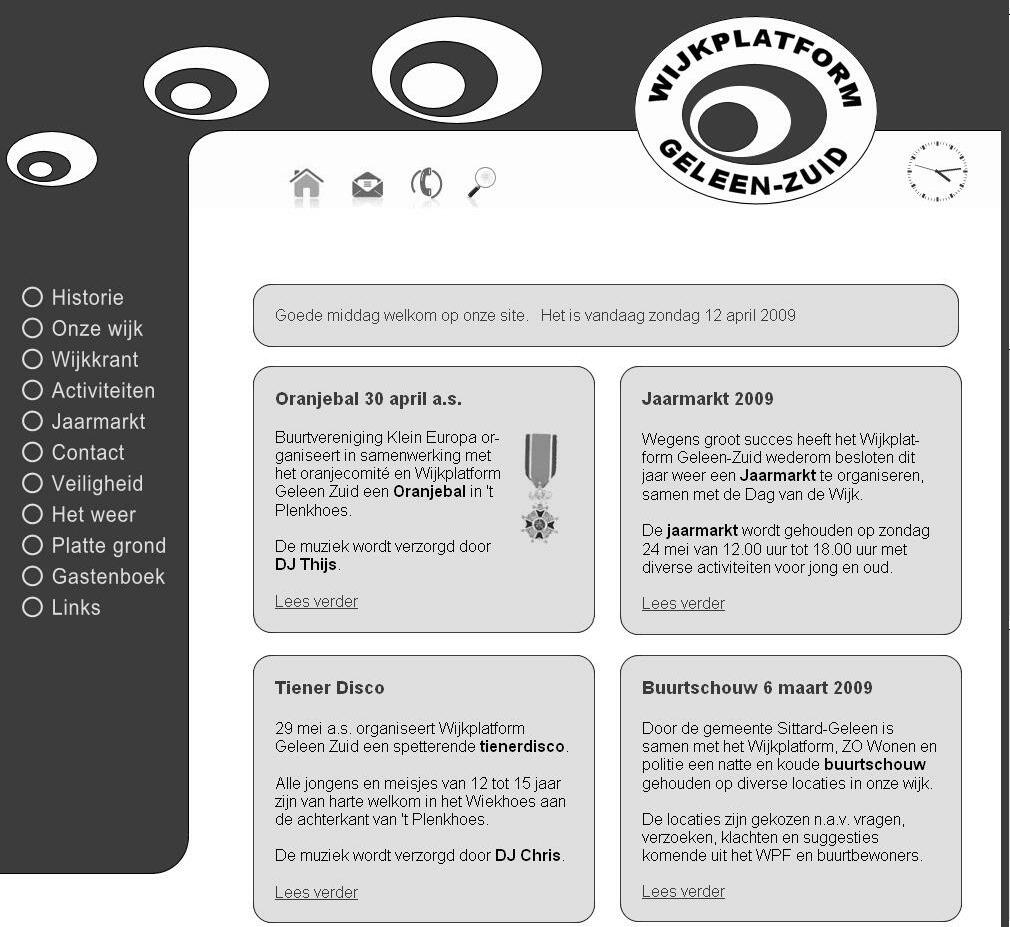 Oponzewebsitevindtualleinformatie met betrekking tot Geleen-Zuid zoals wijkinformatie, activiteiten, veiligheid, jaarmarktenplattegrondvanonzewijk. OokwordthetweervanGeleen aangegeven.Via de buienrader online kuntuhetactueleweervandedagzien. Dedatazijngebaseerdopgegevensvan hetKNMIwelkeiedere5tot10 minuten worden bijgewerkt. De site heeft diverse onderdelen. Zo kunt u ook iets schrijven in ons Gastenboek.