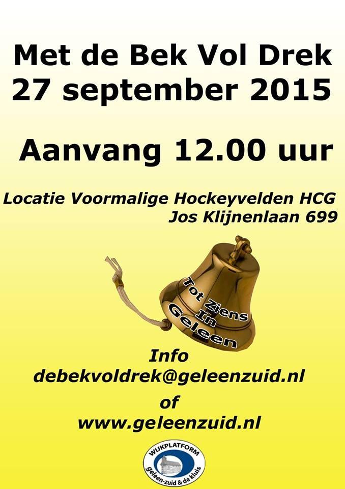 Dit jaar organiseert het wijkplatform een groot evenement voor jong en oud, genaamd: “Met de Bék Vól Drék”. Dit is exact hetzelfde als ter land ter zee en in de lucht maar dan “hie in Gelaen Zuid” De bedoeling is dat de deelnemers over een smalle lat gaan met een zelf gemaakt voertuig (hoe orgineler hoe beter) om zo snel mogelijk naar de bel te gaan en daar vervolgens aan te trekken. Het kan ook mis gaan, dan zullen de deelnemers in een grote bak met modder terecht komen. Er zijn schitterende prijzen te winnen! Voor alle leeftijden is er genoeg te doen. Verdere informatie volgt. Indien u nog vragen heeft mail ons gerust, via mailadres; debekvoldrek@geleenzuid.nl Tot ziens op zondag 27 september a.s.