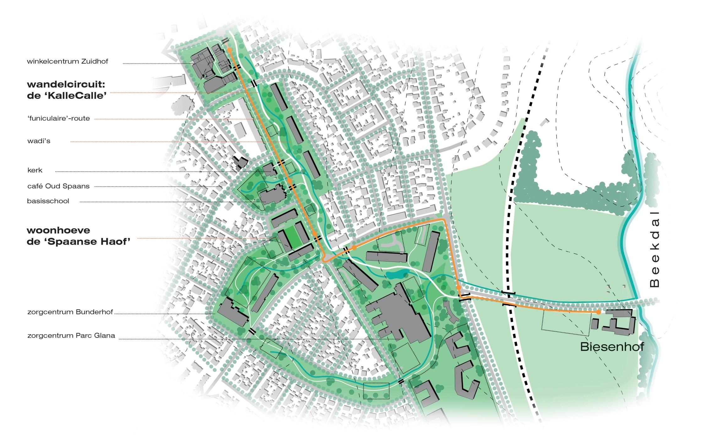 In Geleen Zuid is de Lienaertsstraat als uitgangspunt gebruikt voor de nieuwe inrichting van de openbare leefruimte. De straat ligt centraal in de wijk en heeft een breed profiel. Langs deze straat liggen verschillende voorzieningen, zoals het winkelcentrum Zuidhof, de Van Ars parochiekerk, basisschool Reuzepas, het nieuwe Parc Glana, en de woonhoeve 'd'n Spaanse Haof' Het team van Hélène Houben stelt een herinrichting van deze straat voor, die ouderen en mindervaliden de mogelijkheid biedt om deze voorzieningen te bezoeken. Herkenbaarheid is een belangrijk uitgangspunt van de wandelroute om ouderen (waaronder ook dementerenden) door de wijk te kunnen leiden. Hiervoor wordt een geleidende rand met herkenbare kleur langs het voetgangers pad voorgesteld. Het pad biedt mensen de mogelijkheid onderweg op verschillende plekken te kunnen rusten. De focus ligt op ouderen en andere kwetsbare groepen en is dus ook geschikt voor mensen met rollator of rolstoel. Maar het voetgangersvriendelijke circuit wordt een route voor alle doelgroepen in de wijk. Er komen bijvoorbeeld ook speelplekken en hondenuitlaatzones. De nieuwe groene wandelroute langs de Lienaertsstraat krijgt de naam de KalleCalle, Kalle (Limburgs: praten) en Calle (Spaans: weg), de ‘PraatStraat’ dus, een voetgangersstraat waar ontmoeten en verbinden centraal staan.