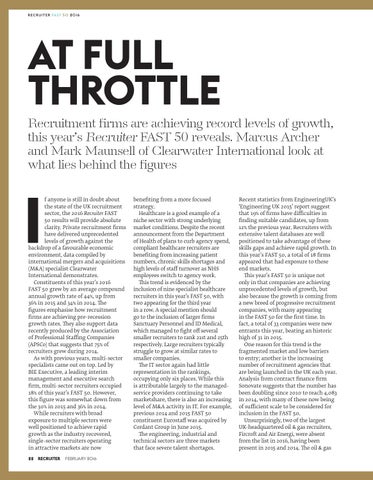 AT FULL THROTTLE Recruitment ïŹrms are achieving record levels of growth, this yearâs Recruiter FAST 50 reveals. Marcus Archer and Mark Maunsell of Clearwater International look at what lies behind the ïŹgures f anyone is still in doubt about the state of the UK recruitment sector, the 2016 Recruiter FAST 50 results will provide absolute clarity. Private recruitment ïŹrms have delivered unprecedented levels of growth against the backdrop of a favourable economic environment, data compiled by international mergers and acquisitions (M&A) specialist Clearwater International demonstrates. Constituents of this yearâs 2016 FAST 50 grew by an average compound annual growth rate of 44%, up from 36% in 2015 and 34% in 2014. The ïŹgures emphasise how recruitment ïŹrms are achieving pre-recession growth rates. They also support data recently produced by the Association of Professional Staffing Companies (APSCo) that suggests that 75% of recruiters grew during 2014. As with previous years, multi-sector specialists came out on top. Led by BIE Executive, a leading interim management and executive search ïŹrm, multi-sector recruiters occupied 18% of this yearâs FAST 50. However, this ïŹgure was somewhat down from the 30% in 2015 and 36% in 2014. While recruiters with broad exposure to multiple sectors were well positioned to achieve rapid growth as the industry recovered, single-sector recruiters operating in attractive markets are now