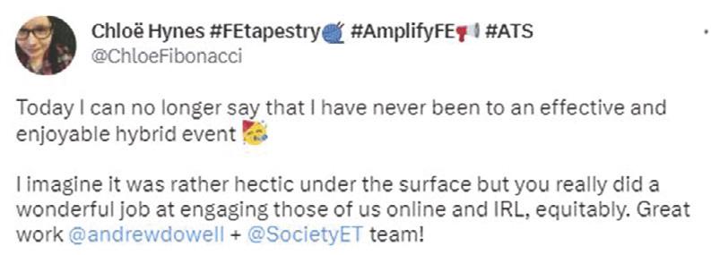 This was a challenge for the organising team but it was nonetheless a successful event, which included a number of presentations and interactive workshop discussions that fell into the categories of developing learners, developing the organisation and developing colleagues, as well as updates from the Education and Training Foundation (ETF) and SET.
