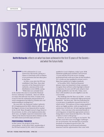 qualified to Level 4 Diploma, today’s post-RDR minimum qualification standard. Fast forward 15 years and the PFS is the sector’s leading professional body with more than 40,000 members, 53% of who are now qualified to at least Level 4. Many have pushed on to higher standards. In December 2005, Chartered financial planner status was launched to help consumers recognise those advisers achieving high technical competence; by year end 389 early adopters had proudly qualified to use the title. Today, more than 7,000 members are now eligible to use the coveted title. The challenge that Mr Tiner set in 2006 – to turn good intentions into consistently high professional standards – has been met. This was underlined by a recent piece of qualitative research for the FCA, which noted: “Perceptions of those using regulated advice are highly positive, with strong levels of satisfaction, for both one-off and ongoing regulated advice. A key outcome is the emotional benefit of receiving peace of mind that appropriate action is being taken to meet financial objectives. The value of advice is clear to this group.” However, we are not resting on our laurels. The last five years have seen even bigger challenges for our profession: the introduction of pension freedoms at breakneck speed in 2015, the hardening market in professional indemnity insurance and the opportunities that come with