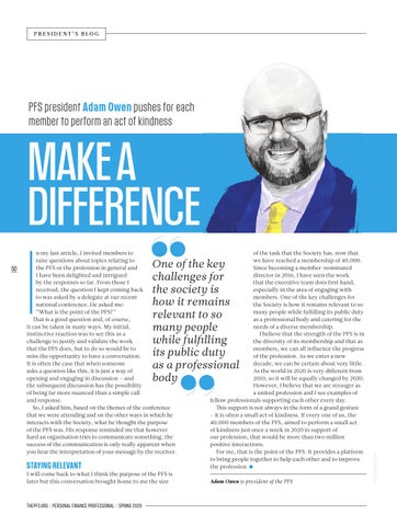 of the task that the Society has, now that we have reached a membership of 40,000. Since becoming a member-nominated director in 2016, I have seen the work that the executive team does first hand, especially in the area of engaging with members. One of the key challenges for the Society is how it remains relevant to so many people while fulfilling its public duty as a professional body and catering for the needs of a diverse membership. I believe that the strength of the PFS is in the diversity of its membership and that as members, we can all influence the progress of the profession. As we enter a new decade, we can be certain about very little. As the world in 2020 is very different from 2010, so it will be equally changed by 2030. However, I believe that we are stronger as a united profession and I see examples of fellow professionals supporting each other every day. This support is not always in the form of a grand gesture – it is often a small act of kindness. If every one of us, the 40,000 members of the PFS, aimed to perform a small act of kindness just once a week in 2020 in support of our profession, that would be more than two million positive interactions. For me, that is the point of the PFS. It provides a platform to bring people together to help each other and to improve the profession. ●