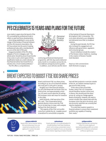 PFS CELEBRATES 15 YEARS AND PLANS FOR THE FUTURE 2020 marks 15 years since the launch of the PFS, prompting the professional body to reflect on past and future developments. Since being established in 2005 via the merger of the Society of Financial Advisers and the Life Insurance Association, the PFS has evolved into the sector’s leading professional body, with a membership of 40,000 at the start of this year. Inaugural president of the PFS, Brian Steeples of Turris in Glasgow, said: “The whole sector should be proud of just how far it has come in such a short space of time. Qualification levels are a stark indicator of how financial advice has moved from an industry into a more trusted profession.” The PFS offers a comprehensive