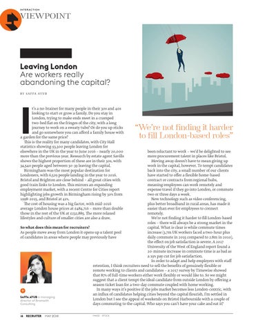 been reluctant to work – we’d be delighted to see more procurement talent in places like Bristol. Moving away doesn’t have to mean giving up work in the capital, however. To tempt candidates back into the city, a small number of our clients have started to offer a flexible home-based contract or contracts from regional hubs, meaning employees can work remotely and expense travel if they go into London, or commute two or three days a week. New technology such as video conferencing, plus better broadband in rural areas, has made it easier than ever for employees to connect remotely. We’re not finding it harder to fill London-based roles – there will always be a strong market in the So what does this mean for recruiters? capital. What is clear is while commute times As people move away from London it opens up a talent pool increase (3.7m UK workers faced a two-hour plus of candidates in areas where people may previously have daily commute in 2015 compared to 2.8m in 2010), the effect on job satisfaction is severe. A 2017 University of the West of England report found a 20-minute increase in commute time is as bad as a 19% pay cut for job satisfaction. In order to adapt and help employers with staff retention, I think recruiters need to sell the benefits of genuinely flexible or remote working to clients and candidates – a 2017 survey by Timewise showed that 87% of full-time workers either work flexibly or would like to. So we might suggest that a client tempt the ideal candidate from outside London by offering a season ticket loan for a two-day commute coupled with home working. In many ways it’s positive if the jobs market becomes less London-centric, with + an influx of candidates helping cities beyond the capital flourish. I’m settled in SAFFA AYUB is managing London but I see the appeal of weekends on Bristol Harbourside with a couple of director of Bramwith days commuting to the capital. Who says you can’t have your cake and eat it? Consulting