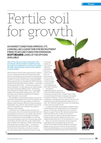 Fertile soil for growth AS MARKET CONDITIONS IMPROVE, IT’S LOOKING LIKE A GOOD TIME FOR RECRUITMENT FIRMS TO SECURE FUNDS FOR EXPANSION. SCOTT BEAGRIE LOOKS AT THE OPTIONS AVAILABLE After all the talk of recovery and growth, if the recruitment industry needed a tangible sign that the good times might just be returning, it would be the public equity markets’ interest in the industry in recent months.