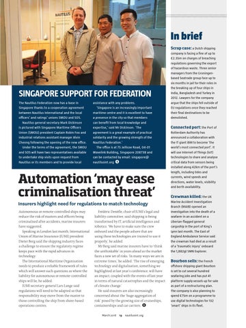 SINGAPORE SUPPORT FOR FEDERATION The Nautilus Federation now has a base in Singapore thanks to a cooperation agreement between Nautilus International and the local officers’ and ratings’ unions SMOU and SOS. Nautilus general secretary Mark Dickinson is pictured with Singapore Maritime Officers Union (SMOU) president Captain Robin Foo and industrial relations assistant manager Alvin Cheong following the opening of the new office. Under the terms of the agreement, the SMOU and SOS will have two representatives available to undertake ship visits upon request from Nautilus or its members and to provide local