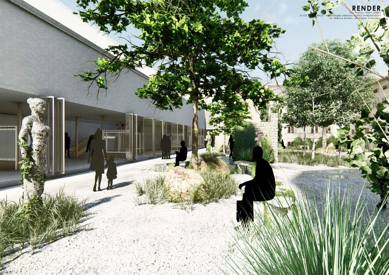 Through our work in the Studio, we posed the question of how we can participate in the spatial and cultural continuity of the place, specifically the archaeological site of the ancient city of Sirmium, with modern design tools. A special focus is directed to the scale that is characteristic of the field of interior architecture, where the question of ergonomics can be considered crucial. Students researched and designed precise interventions and design positions in relation to the specific context and content. Following are the results of this work, which show contemporary models of presentation and interaction with the cultural heritage of the archaeological site.