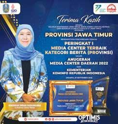 Penghargaan ini diterima Ke pala Dinas Komunikasi dan In formatika Provinsi Jatim Hudi yono yang mewakili Gubernur Jatim dalam ajang Anugerah Media Center Daerah 2022 yang diselenggarakan Kementerian Komunikasi dan Informatika di Tangerang Selatan, Banten, Senin (26/9/2022) lalu. Atas prestasi tersebut, Gubernur Jawa Timur Khofifah Indar Parawansa berkomitmen untuk terus me ningkatkan layanan informasi yang berkualitas bagi seluruh masyarakat khususnya Jawa Timur. Pasalnya informasi yang