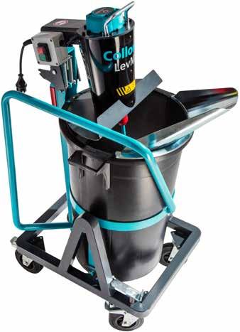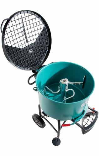 Der klappbare Schwenkarm mit der Schutzhaube deckt den Mischbehälter ab. Wird der Deckel geöffnet, stoppt das Mischwerk. Der Anschluss einer externen Staubabsaugung ist vorgesehen, um die Belastung mit Zementstaub deutlich zu reduzieren. Schonen Sie Ihren Rücken beim Einsatz des zusätzlich erhältlichen Transportwagens um die Eimer zu transportieren und nicht zu schleppen.