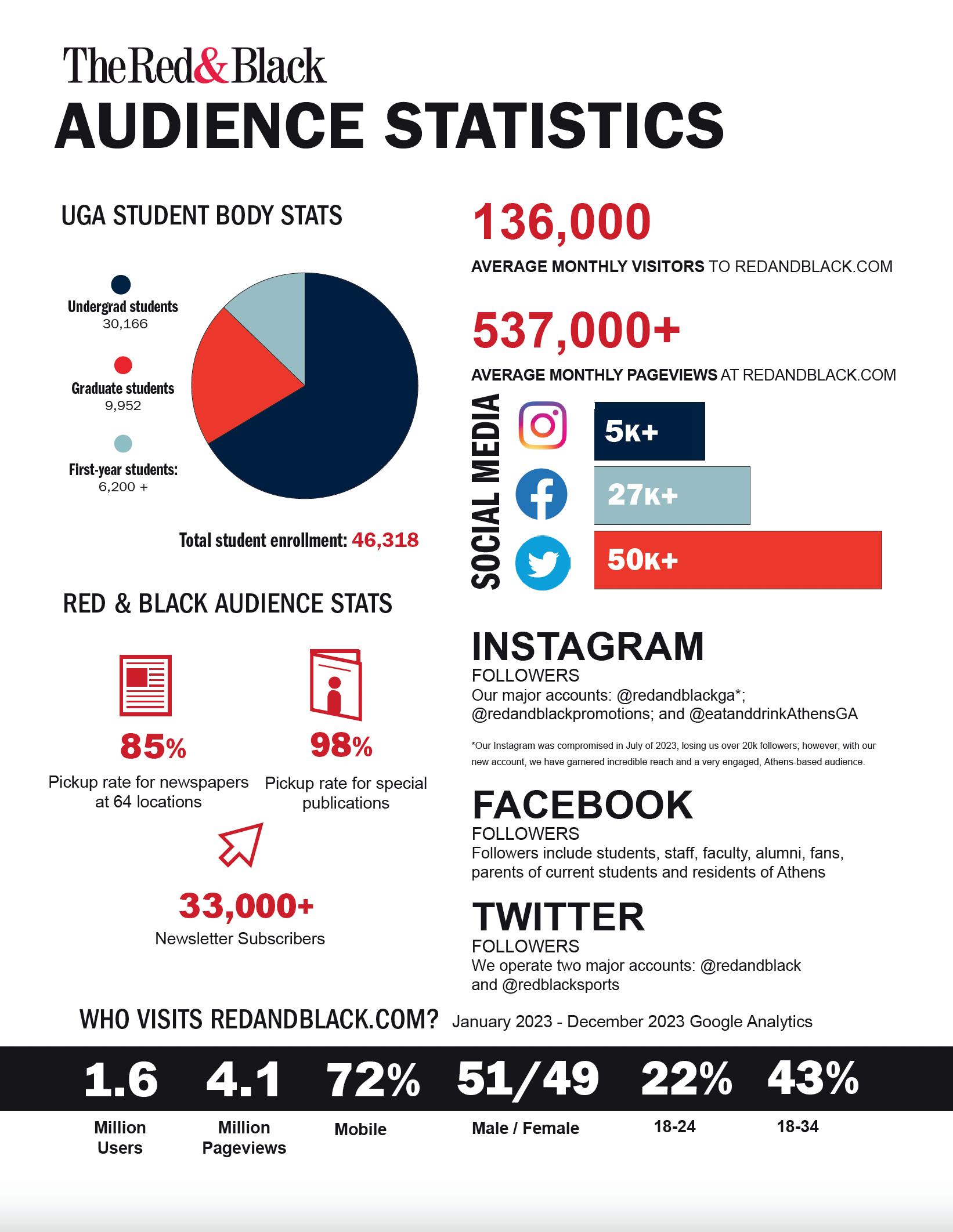 We’ve invested in breaking news coverage and have the only sports desk that covers every varsity team at UGA. At redandblack.com we offer must-read news for a growing audience. Ads on our site allow you to connect with tens of thousands of readers, including current students and a vast, passionate alumni network.