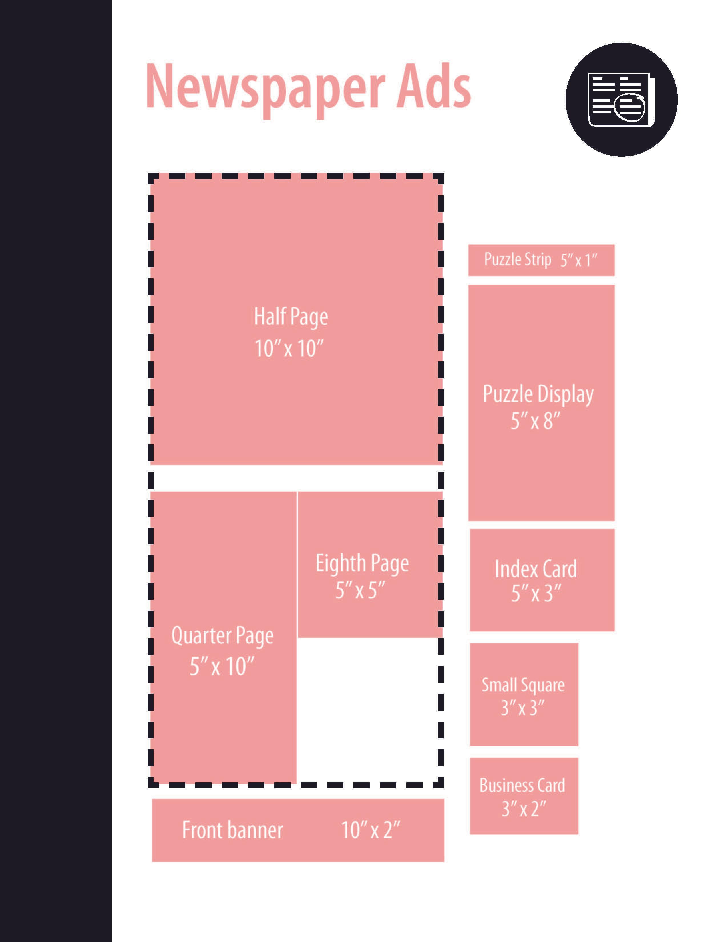 Ptin Adetixing Inxetx Handåoå Hand Fletx PoxåIx In papers distributed on campus In monthly newspaper or special edition on A1 In monthly newspaper or special edition 500 count 5,000 count 5,000 count 3" x 3" 11"x 11" max 4"x6" min 8.5"x 11" max 4"x6" min $250 $875 $800 FRONT BANNER PUZZLE DISPLAY PUZZLE STRIP Needed at our printer 9 days prior to the run date Needed at our office 1 day prior to the run date Artwork needed 15 days prior to the run date