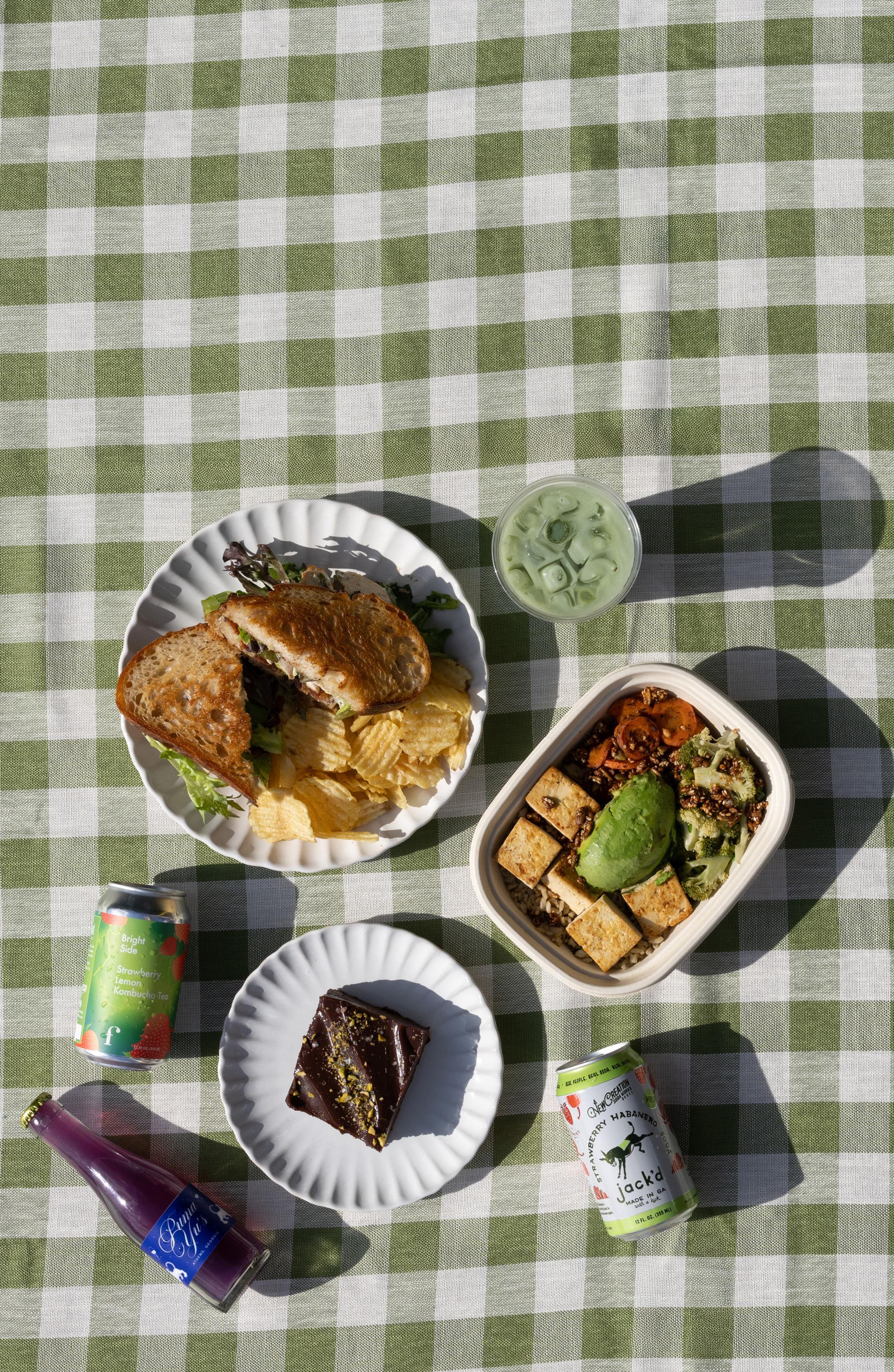 Iced matcha latte from Buvez Sandwich, chips and brownie from Athens Cooks Tofu bowl from Maepole Bottled gimlet cocktail from Puma Yu's Kombucha from Figment Kombucha Soda from New Creation Soda Works