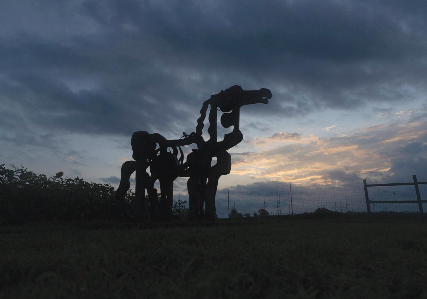 The sun rises behind the Iron Horse at the Iron Horse Plant Sciences Farm on a cloudy morning. PHOTO COURTESY/PETER FREY, UGA