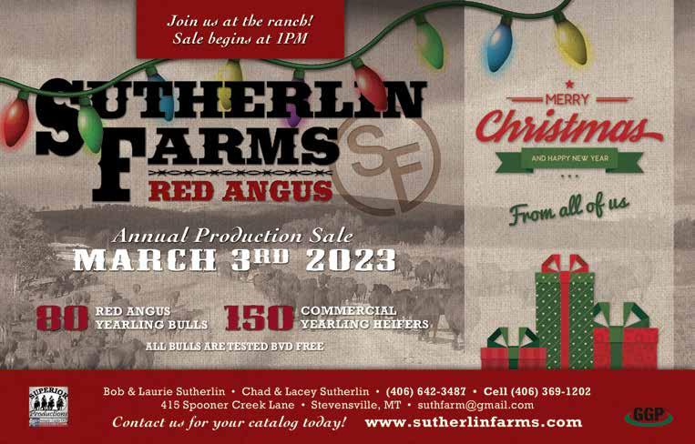 The cows and crew at Red Hill are thankful for: Bart, Sarah & Ty Jones • (615) 666-3098 466 Red Hill Road, Lafayette, TN 37083 mail@redhillfarms.net Gordon & Susan Jones • (270) 991-2663 Visit www.RedHillFarms.net for information about our sale and breeding program. 258Z Selling: 70 Red Angus, SimAngus™, Charolais & Cross-Ty Bulls XVIII MORE THAN A BULL SALE Saturday, March 18, 2023 1 p.m. CDT • At the Farm 18th Annual Good Grass | Good Health | Special Customers Merry Christmas and Thank You for a Great 2022! Magazine Red Angus Association of America 18335 E. 103rd Ave., Suite 202 Commerce City, CO 80022 Reaching over 10,000 Red Angus Buyers evey issue!