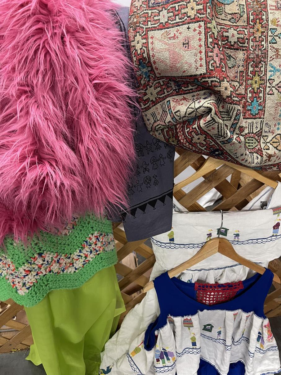 "Prayforpeace"modeledbySebastianMay,materialsusedaremultiple tablecloths,dishtowels,decorativeflag,lacevintageappliques