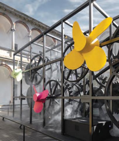 portata avanti dal cantiere verso soluzioni tecnologicamente innovative per ridurre l’impatto ambientale dello yachting. Si tratta di una imponente scultura metallica: una macchina complessa, altamente tecnologica ma definita nei dettagli da un sapiente lavoro manuale proprio come uno yacht. L’intera struttura, posizionata al centro del cortile, poggiava su una piattaforma che esalta un meccanismo realizzato con eliche e ruote dentellate. Queste si muovono grazie al nuovo sistema a idrogeno da metanolo verde, che Sanlorenzo sta sviluppando per la propulsione delle proprie imbarcazioni in collaborazione con Siemens Energy, basato sull’impiego di moduli combinati di reformer/fuel cell. Questa tecnologia verrà impiegata per l’alimentazione dei servizi di bordo su yacht tra 24 e 73 metri di lunghezza, a partire dal 2024 sul nuovo 50Steel. Questo progetto di assoluta avanguardia rappresenterà il primo passo concreto nella generazione di potenza carbon neutral, originata da combustibili di nuova generazione per l’intero settore, portando Sanlorenzo a ricoprire il ruolo di assoluto apripista nella strada verso la nautica sostenibile.