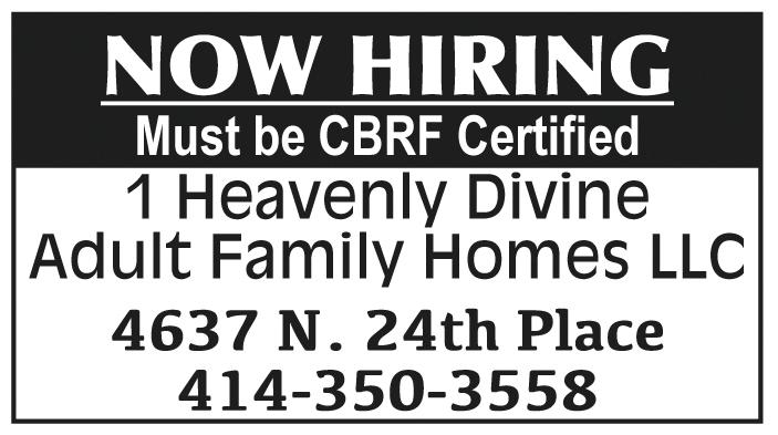 Older personal care worker, for special needs daughter. Brown Deer area, must have own vehicle. Hiring immediately. 414-803-0339. 12/27