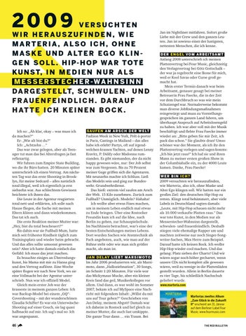 2009 versuchten wir herauszufinden, wie Marteria, also ich, ohne Maske und Alter Ego klingen soll. Wir hatten nur ein großes Ziel: den deutschen Hip-Hop zu retten. Klingt total behämmert, aber viele Labels in Deutschland sagten damals: „Leute, mit Hip-Hop schauen nicht mehr als 10.000 verkaufte Platten raus.“ Das war tote Kunst, in den Medien nur als Messerstecher-Wahnsinn dargestellt, schwulen- und frauenfeindlich. Deshalb stiegen viele ehemalige Rapper um und machten zeitweise nur noch Singer-Songwriter-Sachen, Max Herre zum Beispiel. Darauf hatte ich keinen Bock. Ich wollte Hip-Hop wieder cool machen. Und das gelang: Platz sieben der Charts! Und wir wären sogar noch höher gechartet, wenn unsere CDs nicht komplett alle gewesen wären, weil zu wenige in die Plattenläden gestellt wurden. Allein in Berlin dauerte es vier Tage, bis schließlich Nachschub geliefert wurde. www.marteria.com Marterias zweites Album „Zum Glück in die Zukunft II“ erscheint am 31. Jänner auf dem Berliner Label Four Music. www.fourmusic.com