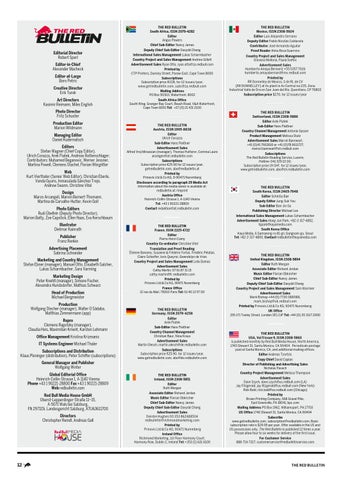 THE RED BULLETIN Austria, ISSN 1995-8838 Editor Ulrich Corazza Sub-Editor Hans Fleißner Advertisement Sales Alfred Vrej Minassian (manager), Thomas Hutterer, Corinna Laure anzeigen@at.redbulletin.com Subscriptions Subscription price €25.90 for 12 issues/year, getredbulletin.com, abo@redbulletin.at Printed by Prinovis Ltd & Co KG, D-90471 Nuremberg Disclosure according to paragraph 25 Media Act Information about the media owner is available at: redbulletin.at /imprint Austria Office Heinrich-Collin-Strasse 1, A-1140 Vienna Tel: +43 1 90221-28800 Contact redaktion@at.redbulletin.com