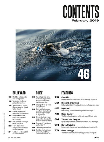 who surfs glaciers 12 Wrap star: the Spyder jacket then and now 14 Aquaman actor Jason Momoa is paying it back to the planet 16 Cordon bleurgh: the Disgusting Food Museum 18 Red Bull Knock Out: motocross mayhem on the beach 20 BMX trickster Kriss Kyle drops into Dubai 22 Score draw: movie composer Max Richter’s soundtrack picks 24 Let there be Nike: a bible for sneaker freaks THE RED BULLETIN