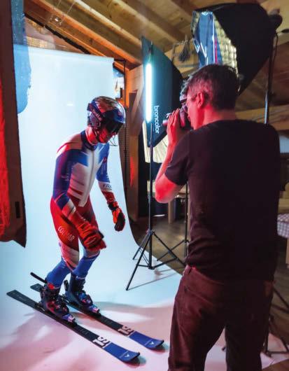 Studio photo improvisé dans un chalet de Tignes pour le suisse Sandro Baebler. Dans son objectif, l’un des meilleurs skieurs au monde : Clément Noël.