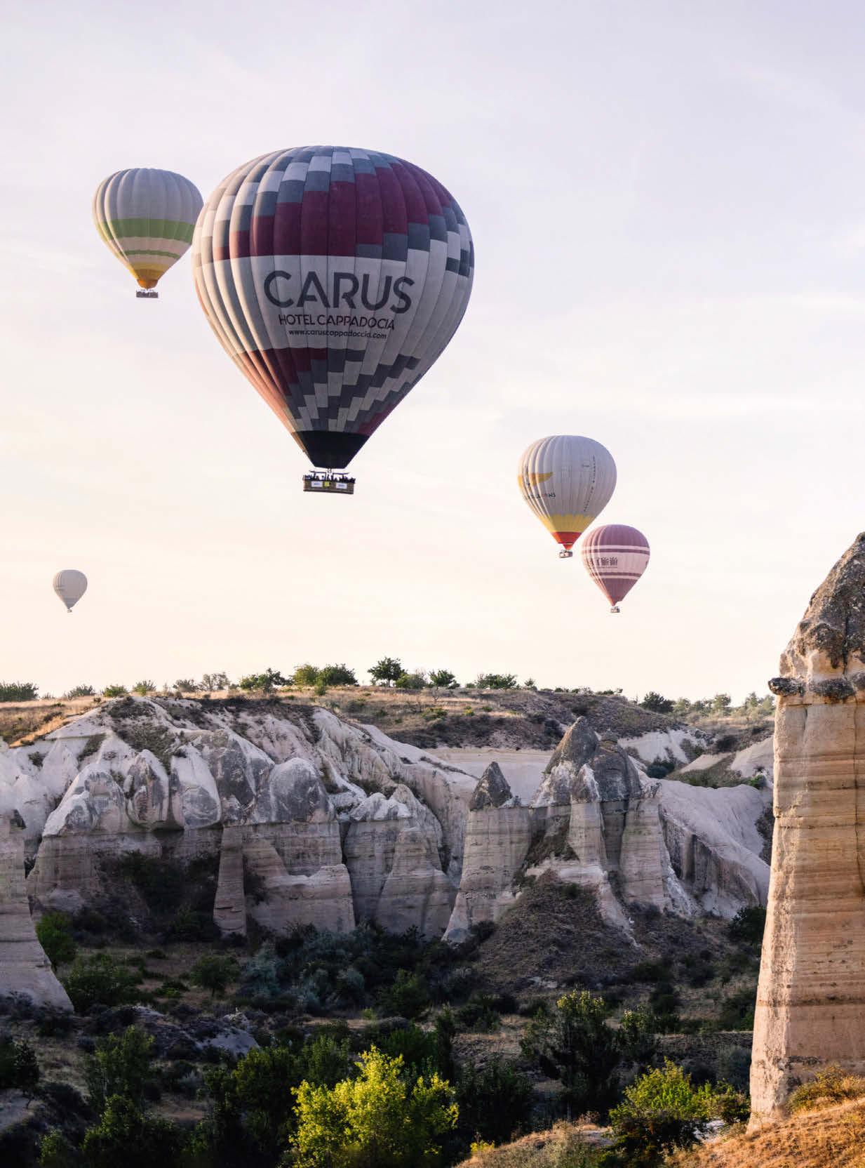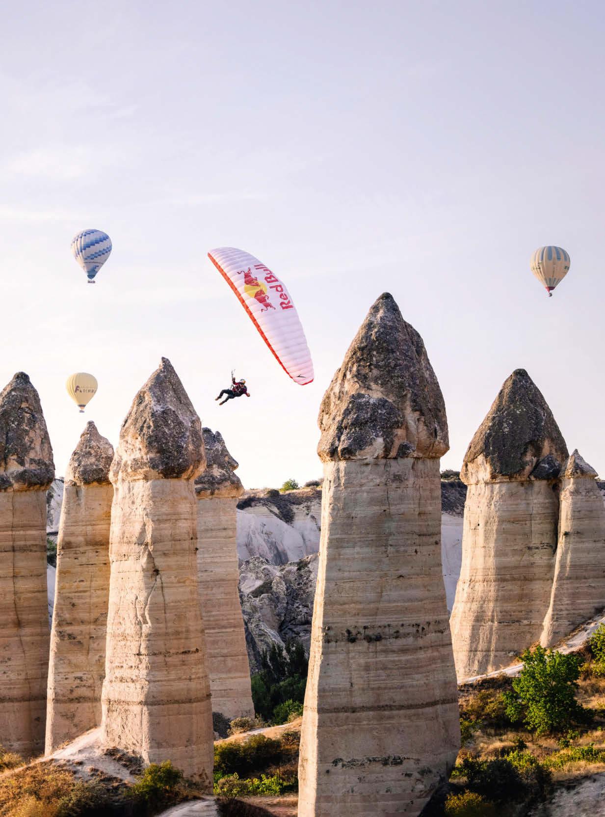 Ceci n’est pas que Valentin Delluc, l’as français du speed-riding (vol de proximité avec une aile et des skis) évoluant au-dessus des cheminées de fées de la Cappadoce… en speed-flying cette fois. En fait, quelques minutes avant cette prise de vue, Val’ a réalisé une première : sauter d’une montgolfière à 2 600 m d’altitude en effectuant un roll over (un saut périlleux en avant). Une figure technique et engagée, quand le vent est soutenu. Ce qui était le cas lors du tournage de la vidéo Fairy Flight de ce trip en Turquie, à voir de suite sur redbull.com ; Instagram : @valentindelluc