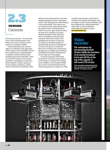 Video recorder The centrepiece for documenting Red Bull Stratos fulfills the functions of an outside broadcast truck and still fits in the top of the capsule. It will record 3TB of data. After everything keeping Baumgartner alive, the video is the most important element: no footage, no proof.
