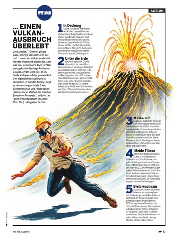 … EINEN VULKANAUSBRUCH ÜBERLEBT Lava, Asche, Trümmer, giftige Gase, winzige Glassplitter in der Luft … wenn ein Vulkan ausbricht, möchte man nicht dabei sein. Aber was tun, wenn man’s doch ist? Der preisgekrönte Geologe Professor Dougal Jerram weiß Rat, er studierte Vulkane auf der ganzen Welt. Den eigentlichen Ausbruch zu überleben ist nur der Anfang, sagt er, denn es folgen heiße Gase, Schlammflüsse und Felsbrocken. „Genau daran starben die meisten Einwohner Pompejis“, erläutert er (beim Vesuvausbruch im Jahre 79 n. Chr.). dougalearth.com