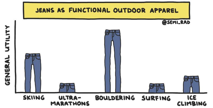 “I worked at an outdoor-gear shop for a year, and I started riding my old mountain bike there, eight miles each way. I might have, in the back of my mind, known that the knobby tyres were less than ideal for city street riding, and one day my shift manager kind of made fun of them. I mumbled something to him about my low rate of pay at the shop, which was true, but what was more true was that I didn’t really care if my bike was fast, or efficient; I just wanted to get some exercise on my way to work. Which I did. I think that in every outdoor sport there’s a blissfully ignorant stage when you’re a beginner and you don’t have the best gear – or even the right gear –and maybe you don’t care, because you’re having so much fun and you don’t know any better. So you just do your thing using what you have, which might include jeans, which I think is great.”