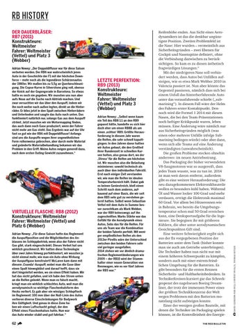 Reifenhöhe enden. Aus Sicht eines Aerodynamikers ist das die denkbar ungünstigste Position. Zweites Problemfeld ist die Nase: Hier wurden – vermeintlich aus Sicherheitsgründen – zwei Ebenen für Cockpit und Nasenspitze definiert, ohne die Verbindung dazwischen zu berücksichtigen. So kam es zu diesen ästhetisch fragwürdigen Lösungen.“ Mit der niedrigeren Nase soll verhindert werden, dass Autos bei Unfällen aufsteigen, wie es etwa Mark Webber 2010 in Valencia passiert ist. Nun aber könnte das Gegenteil passieren, nämlich dass sich bei einem Unfall das hinterherfahrende Auto unter das vorausfahrende schiebt („submarining“). In diesem Fall wäre der Helm des Fahrers erster Kontaktpunkt. Dennoch wird die Formel 1 2014 mit diesen Nasen, die bei den Team-Präsentationen noch heftiger Kritikpunkt waren, leben müssen. Eine Änderung wäre nämlich nur aus Sicherheitsgründen möglich (was einen oder mehrere Unfälle infolge Submarining bedingen würde) oder aber dann, wenn sich alle Teams auf eine Änderung verständigten (unwahrscheinlich). Die großen Probleme stecken ohnehin anderswo: im neuen Antriebsstrang. Das Packaging der bisher verwendeten V8-Saugmotoren war so ausgereift, dass jedes Team wusste, was zu tun ist. 2014 ist man weit davon entfernt, außerdem gibt es eine weitere Herausforderung: Die neu dazugekommenen Elektronikbauteile wollen es besonders kühl haben. Während Öl und Wasser locker 100 Grad und mehr verdauen, erträgt die Elektronik maximal 60 Grad. Vor allem bei Hitzerennen wie in Bahrain, wo bereits die Umgebungstemperatur schon mal 50 Grad erreichen kann, eine Denksportaufgabe für die Ingenieure. Sie begegnen ihr mit größeren Kühlern, die aber unter aerodynamischen Gesichtspunkten Gift sind. Eine weitere Schwierigkeit ergibt sich aus der fix vorgegebenen Position der Batterien unter dem Tank (bisher konnte man sie auch am Getriebe unterbringen). Die Techniker haben nun nicht nur mit einem höheren Schwerpunkt zu kämpfen, sondern auch mit einer extrem feind lichen Umgebung für die Batterien. Es gibt besonders für die ersten Rennen Sicherheits- und Haltbarkeitsbedenken. In Technikerkreisen kursiert gar das Schreckgespenst des n agelneuen Boeing Dream liner, der trotz der immensen Power eines der größten Technikkonzerne der Welt wegen Problemen mit den Batterien monatelang nicht aufsteigen konnte. Einer der wenigen großen Bauteile, mit denen die Techniker im Packaging spielen können, ist die Kontrolleinheit des Energiethe red bulletin