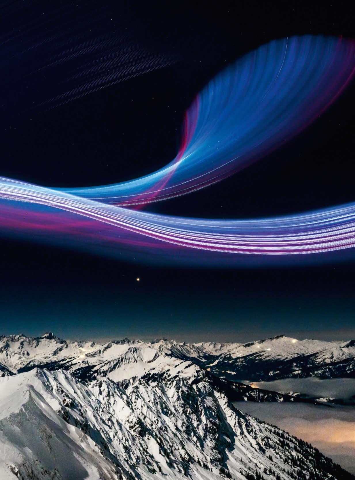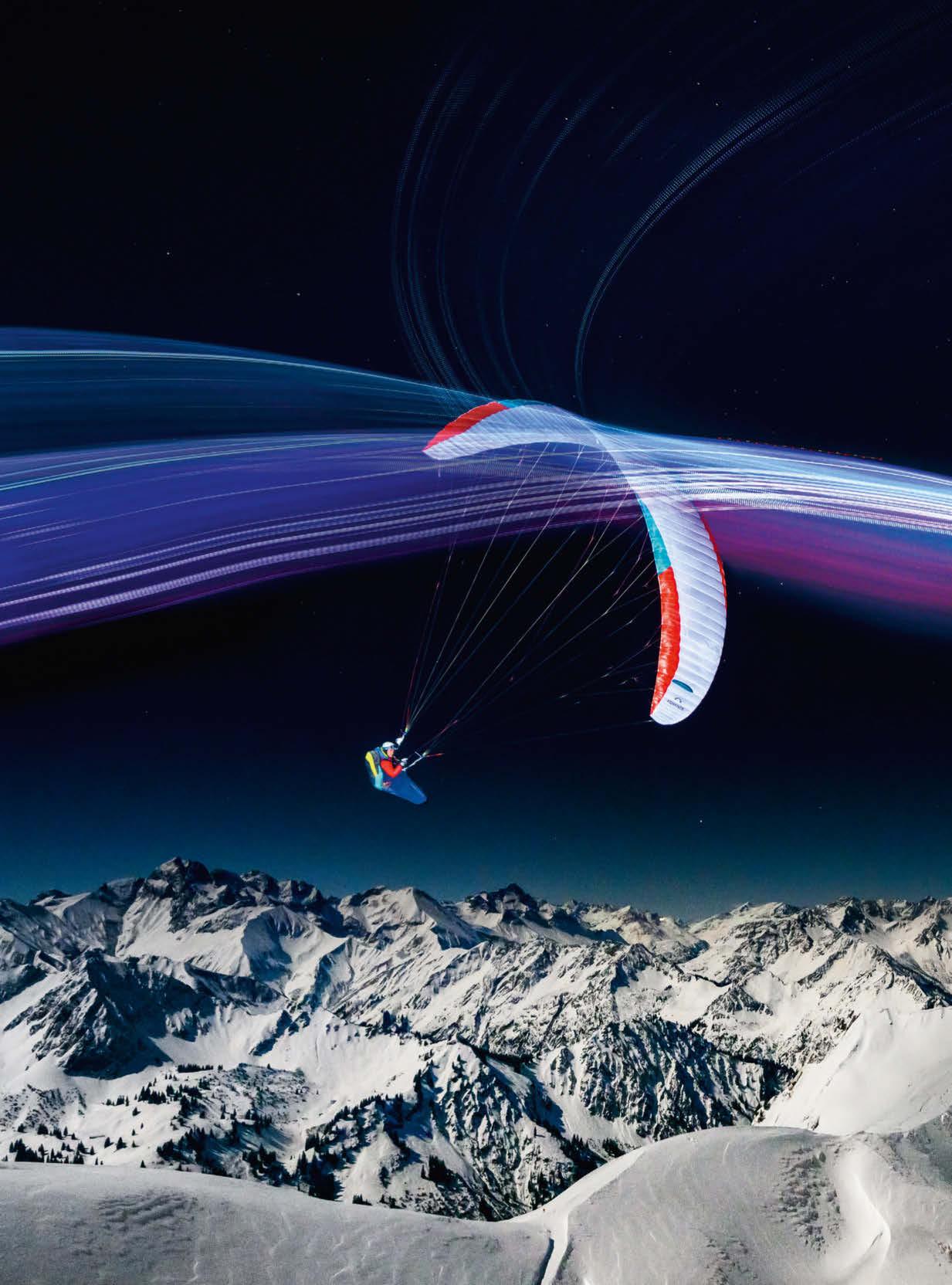Air, eau, feu et terre sont à l’honneur de notre galerie, ouverte par le parapentiste Michael Lacher et le photographe Adi Geisegger. Magie athlétique pour Lacher au-dessus du Nebelhorn, à 2 224 mètres ; celle de Geisegger utilise de puissantes lampes de poche, une longue exposition et 320 LED sur l’arrière du cerf-volant. Ils accèdent à la demi-finale de la catégorie Masterpiece by SanDisk Professional du concours photo Red Bull Illume. adigeisegger.com ; redbullillume.com