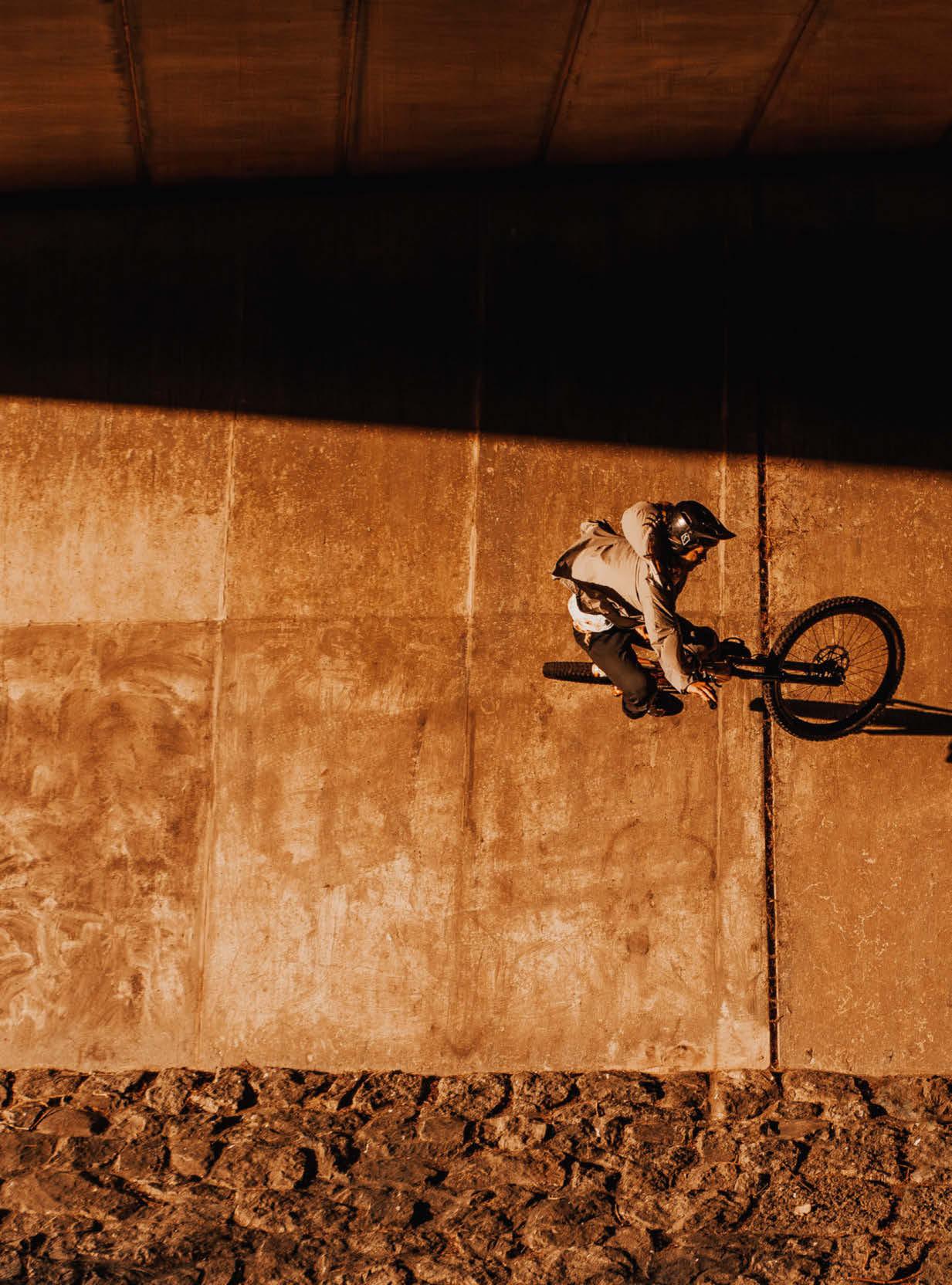 Dunkel, hell – um Kontraste herauszuarbeiten, reichen in der Regel Lichtspots und Blitzanlage. Doch hier geht es um einen ganz speziellen Farbton: dieses satte, fast goldene Rotbraun, das nur ein Sonnenuntergang auf Betonplatten wirft. Das Zeitfenster dafür, sagt Fotograf Craig Robinson, beträgt 20 Minuten. Doch die reichten für Ben, den Biker, um über seinen eigenen Schatten zu springen. redbullillume.com