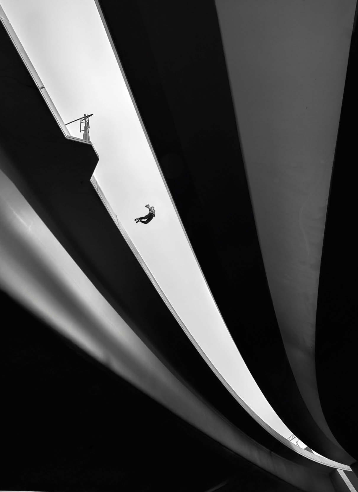 Eigentlich ist diese dünne graue Linie, die am oberen Ende des Bildes einen Wendekreis umschließt, ja bloß eine Leitplanke in einem Skatepark. Doch Enaitz Odria, der Athlet am Board, funktioniert sie zur Gleitplanke um. Und so wird aus einem Foto ein Kunstwerk: „Ich möchte Bilder machen, die auffallen“, sagt Fotograf Alex Berasategi, der sich für sein DrohnenBild einen Platz im Finale von Red Bull Illume (in der KreativKategorie) gesichert hat. redbullillume.com