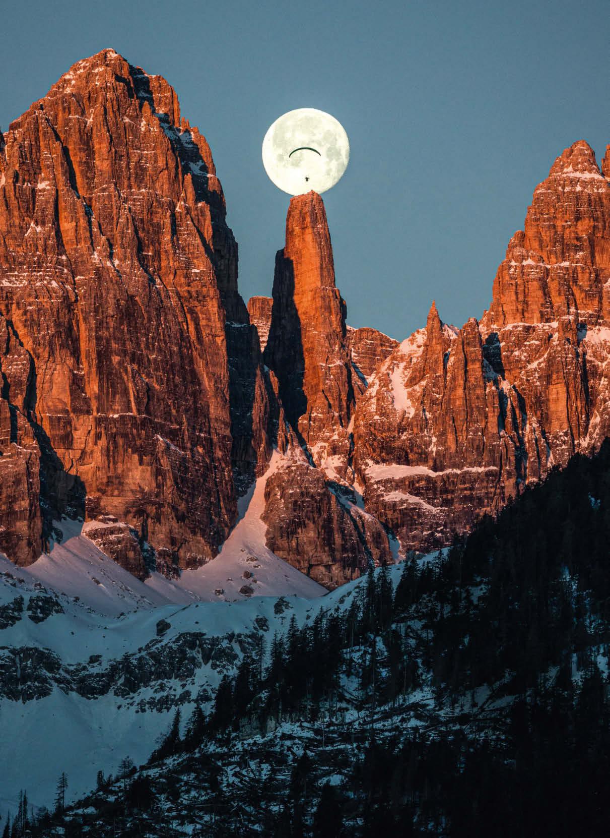 Drei Jahre dauerte es, bis dieser Shot im Kasten war, sagt Fotograf Filippo Frizzera. Der Vollmond steht in der Morgendämmerung direkt über dem Gipfel des Campanile Basso (2.883 m), einer steil aufragenden Felsspitze des Brenta-Massivs. Darin zentriert: der Gleitschirmfieger Marco Diliberto, dem es gelang, sich ohne GPS und nur mit Funkkontakt für den Bruchteil einer Sekunde genau vor der Mondscheibe zu positionieren. Und Frizzera drückte ab.