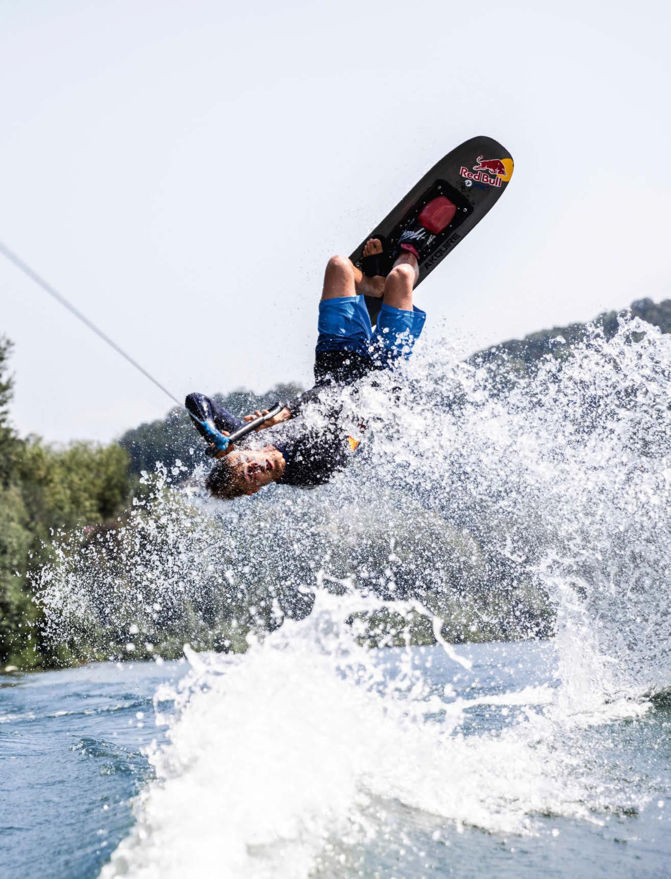Hier wirft sich der kanadische Wasserskifahrer Dorien Llewellyn bei den World Waterski Open 2020 in Pose. Er war der Champion der Panamerikanischen Spiele, als er 2019 in Lima Gold gewann, und sammelte 21 nationale Titel. Diesen Sommer kehrt der 27-Jährige für Contests nach Österreich zurück und besucht dabei auch seine Heimat Gmunden, wo seine Mutter Britta Grebe, selbst zweifache Wasserski-Weltmeisterin, den regionalen Nachwuchs trainiert. Und ja: Er dreht durch, Überschlag mit anschließender Wasserlandung gegen die Fahrtrichtung!