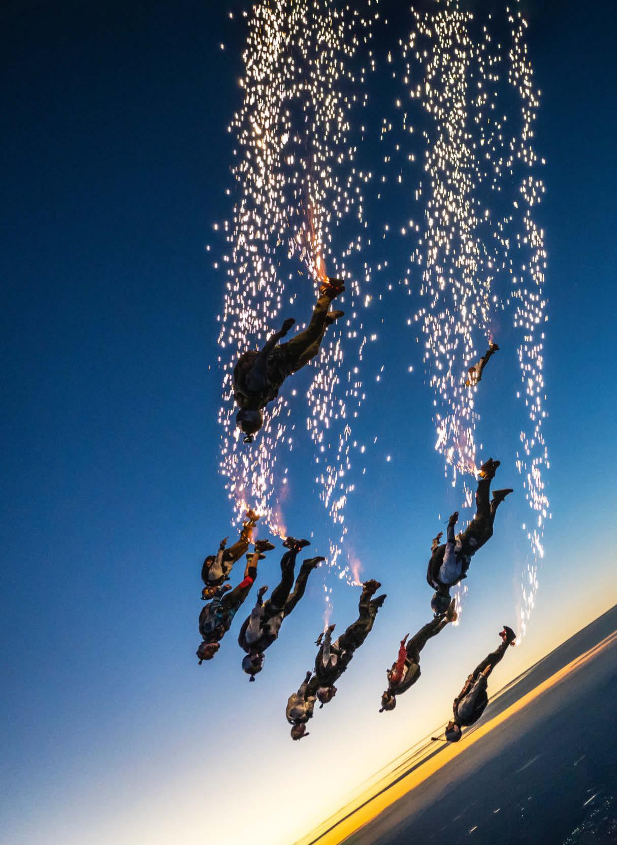 Unendliches Flachland und kein Nachbar weit und breit: Eloy, Arizona, ist der perfekte Ort für Einsiedler und Fallschirmspringer, weshalb sich dort der größte Sprungplatz der Welt befindet. Über 100.000 Skydiver pro Jahr fallen hier vom Himmel. Bei so viel Andrang kann es schon mal dunkel werden, bis man an der Reihe ist. Gut, dass das Red Bull Skydive Team bei seinem Übungssprung im Februar glitzerndes Licht dabeihatte. flyingbulls.at