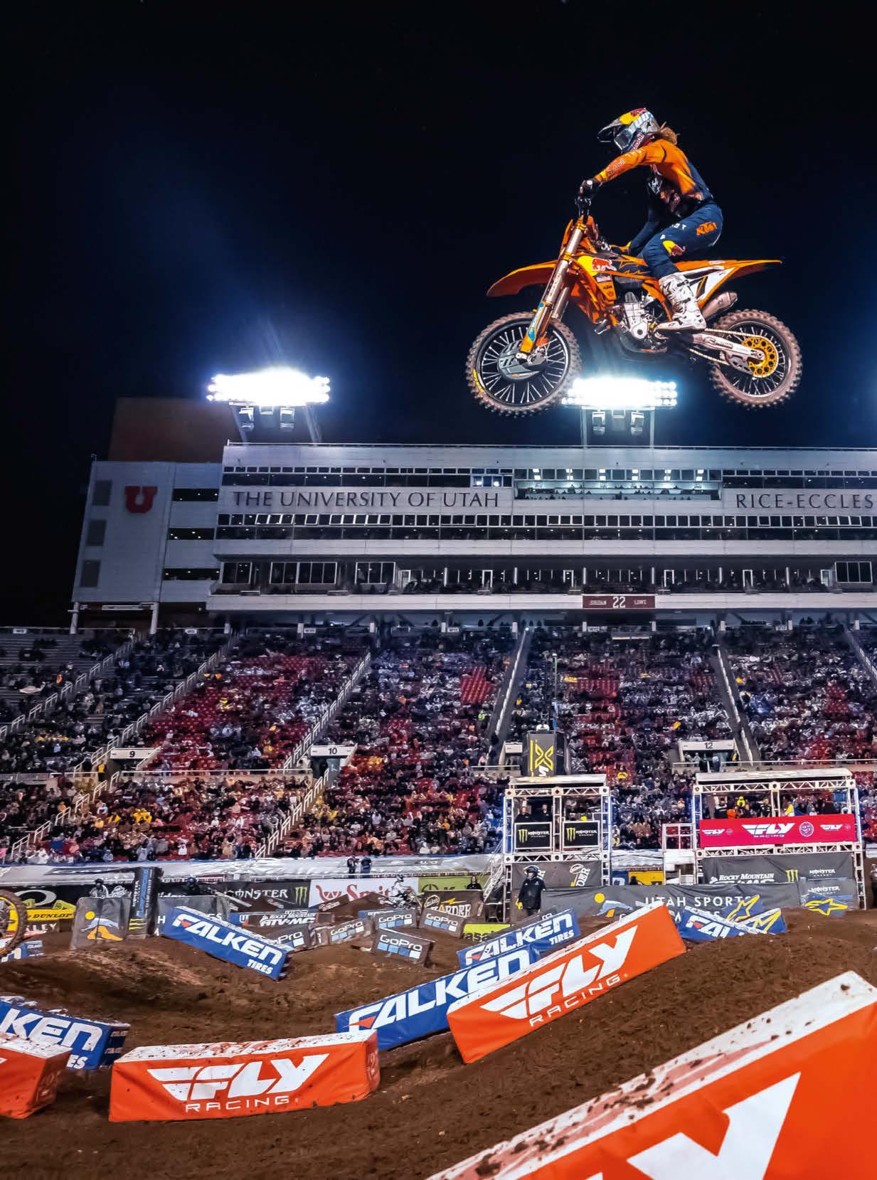 Le type en selle (ou plutôt hors selle), c’est Aaron Plessinger, champion 2018 de supercross et de motocross, qui a participé à la 17e manche de l’AMA Supercross Championship au Rice-Eccles Stadium, en mai dernier. Lorsqu’il a atterri enifn, le natif de l’Ohio, 27 ans, qui avait manqué les trois manches précédentes en raison d’une blessure, a pris la place de vice-champion devant une arène à guichets fermés (49 871 personnes). Quel retour en force ! redbullcontentpool.com
