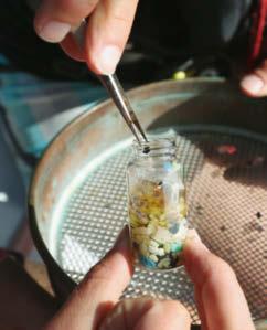 Waste measurements: (from top) X Trillion director Eleanor Church on board; tiny plastic debris trawled from the ocean during the expedition