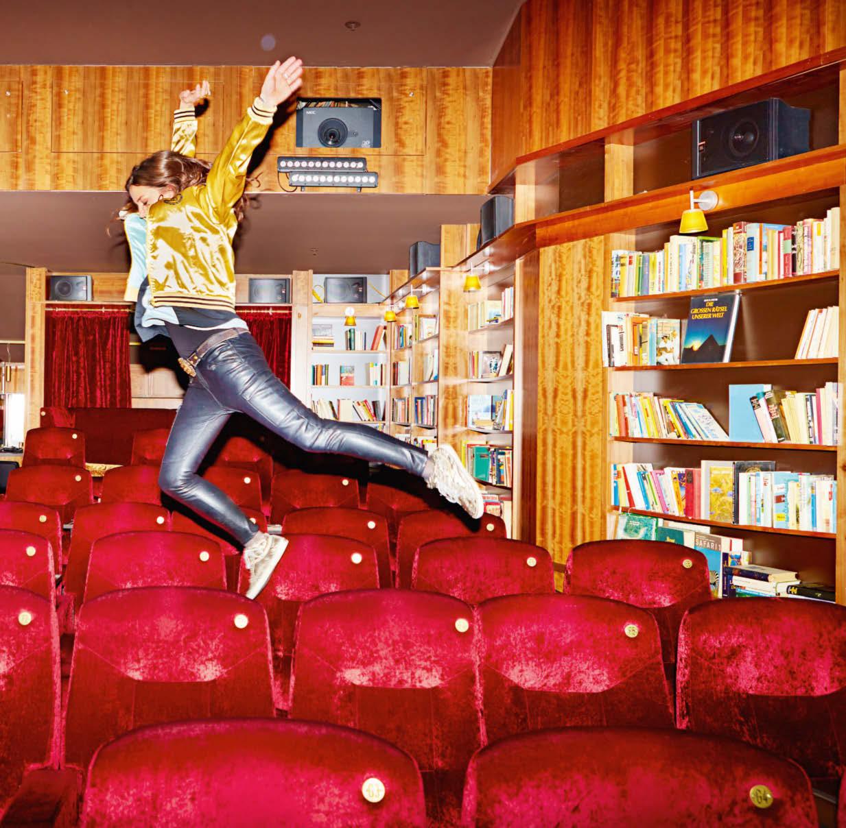 „Ich liebe es, wenn ein Bild Widersprüche vereint. Wie hier: Einerseits ist dieser Raum ein Kino – aber irgendwie auch eine Bibliothek. Eigentlich hatte ich Regisseurin Katja von Garnier, die unter anderem den Film ‚Ostwind‘ inszenierte, nur gebeten, sich auf einen Stuhl zu stellen. Der Vorschlag zu springen kam dann von ihr. Danke an dieser Stelle!“