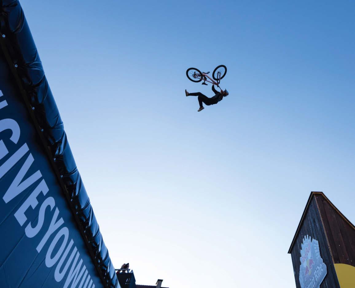 Fabio Wibmer ist hardcore: Der 27-jährige Biker aus Österreich sprang aus Helikoptern, balancierte sein Gefährt auf dem Geländer eines Staudamms und jagte Pisten hinunter, als hätte er Ski an den Füßen. Seine viral gehenden Videos sind belieb ter als die von Kim Kardashian beim Shopping: Die Schallmauer von einer Milliarde Clicks hat er bereits durchbrochen, und für das Video „Fabiolous Escape“ konnte er alle 99 Einwohner des Bergdorfs Oberpeischlach, aus dem er stammt, zur Mitwirkung mobilisieren.