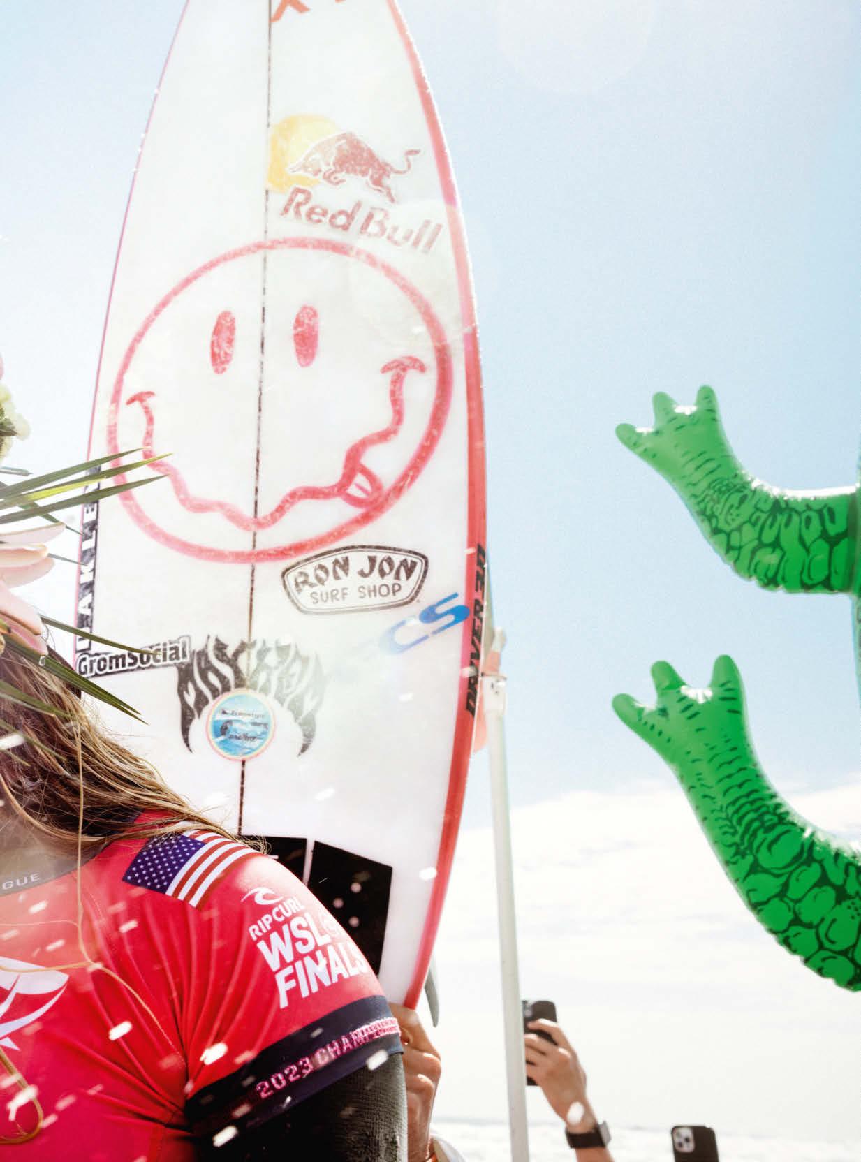 Es ist dieser magische Moment direkt danach. Der Moment, in dem zu sickern beginnt, was da soeben passierte: Caroline Marks aus Florida hat sich mit ihren 21 Jahren zur Weltmeisterin in der World Surf League, kurz WSL, gekürt. Und es war nicht irgendeine, die sie da besiegte: Carissa Moore, die Hawaiianerin mit den fünf WM-Titeln. Blumenbekränzt feiert Marks ihren Triumph. Und ein Gummikrokodil feiert mit. Instagram: @caroline_markss