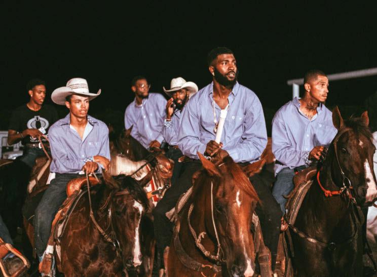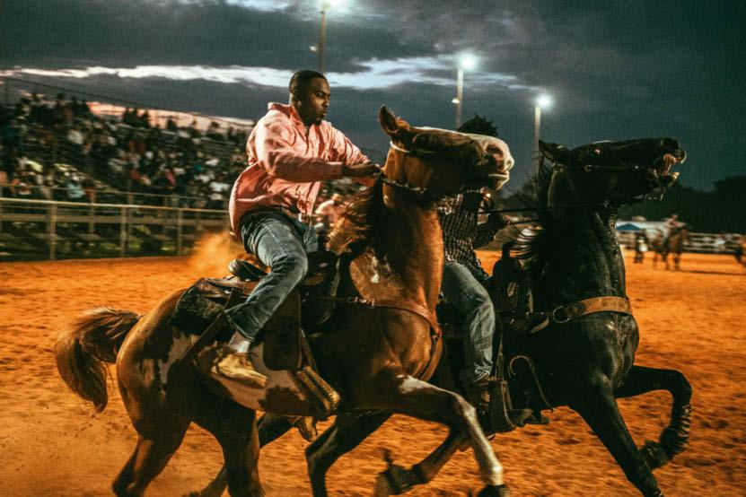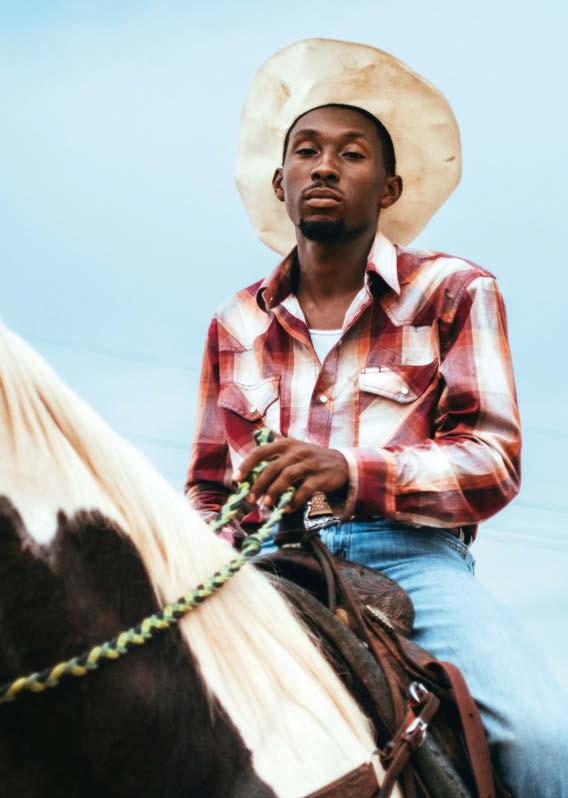 Tout a changé en 2015, lorsqu’il a été invité à son tout premier rodéo noir. « J’ai vu des milliers de cow-boys et cow-girls noir·e·s, se souvientil. On entendait du R&B et du hip-hop dans les vans des chevaux. La fumée des barbecues formait un épais brouillard au-dessus de la pelouse. De jeunes hommes caracolaient torse nu, avec des chaînes en or autour du cou et des Jordan aux pieds. Des femmes laissaient flotter leurs longues tresses au vent tandis qu’elles fonçaient à 80 km/h, agrippant les rênes avec leurs longs ongles artificiels…