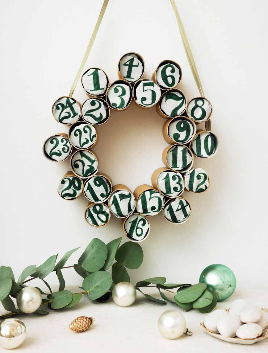 Der Kranz aus Kartonrollen ist schnell gemacht und sieht richtig hübsch aus. Einfach die Rollen von Toilettenpapier oder Küchenkrepp sammeln, in 5 cm breite Ringe schneiden und kreisförmig aneinanderkleben. Dann die Zahlen von 1 bis 24 auf Seidenpapier malen, kleine Geschenke darin einwickeln und so in die Öffnungen stecken, dass die Nummern gut lesbar sind. An einem Band an die Wand montieren – fertig!