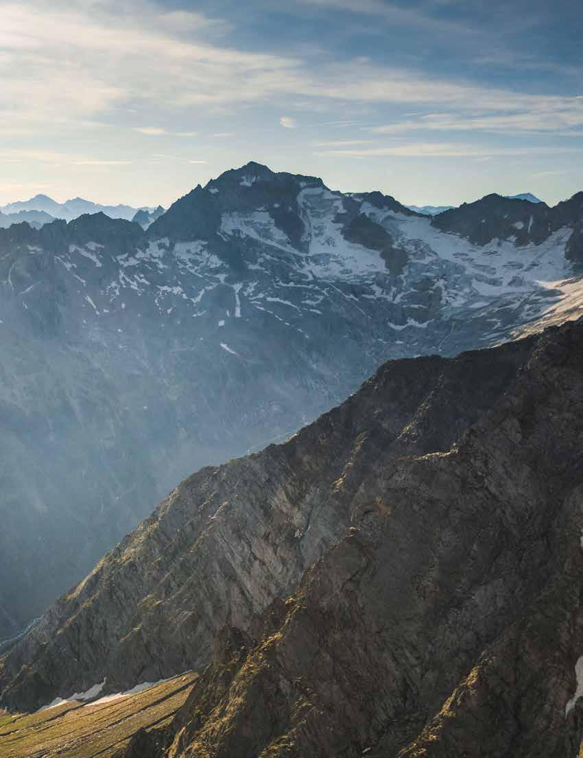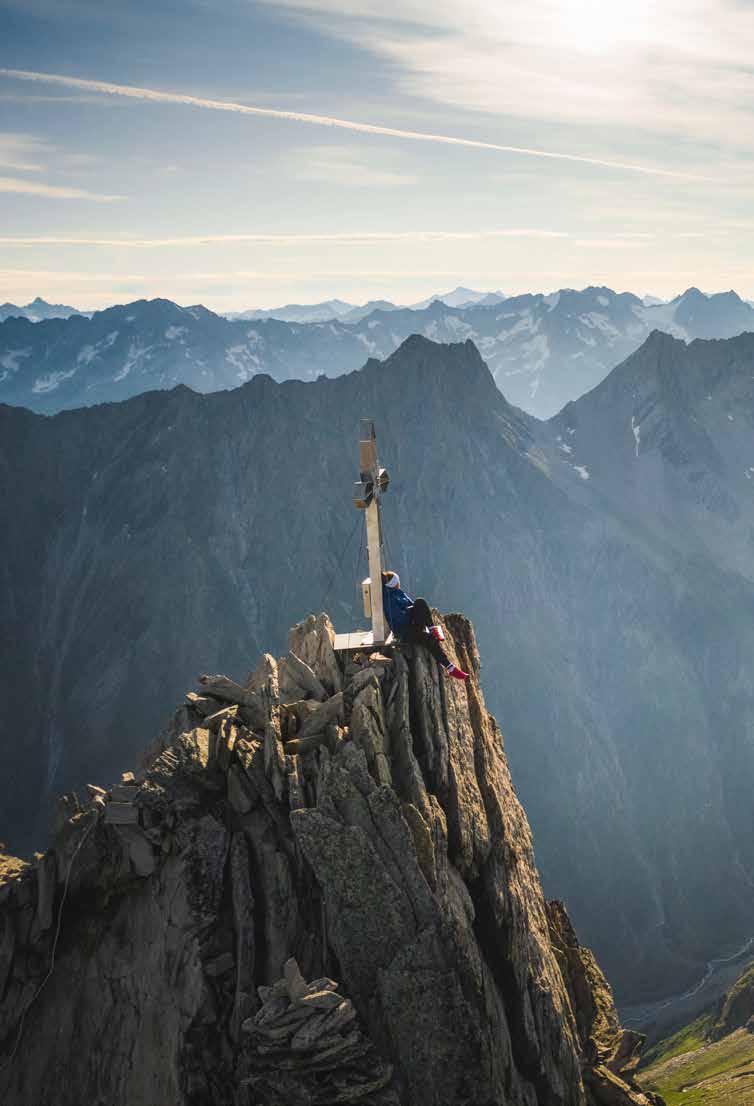 Höher als der Gipfel Guten Morgen auf 3.089 Metern in Tirol: Der Aufstieg auf die Zsigmondyspitze im Zillertal ist nicht ohne, aber geschafft. Anna Maria Gürtler macht es sich beim Gipfelkreuz gemütlich und blickt hinüber in Richtung Großer Löffler (rechte Seite), der bereits teilweise in Südtirol liegt. Zum Großvenediger, der über Anna Maria ganz hinten am Horizont aus den Hohen Tauern ragt, ist es wesentlich weiter. An diesem Tag sieht man ihn vom Gipfel aus aber deutlich – und auf dieser Luftaufnahme noch besser.