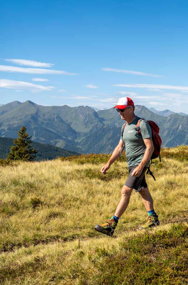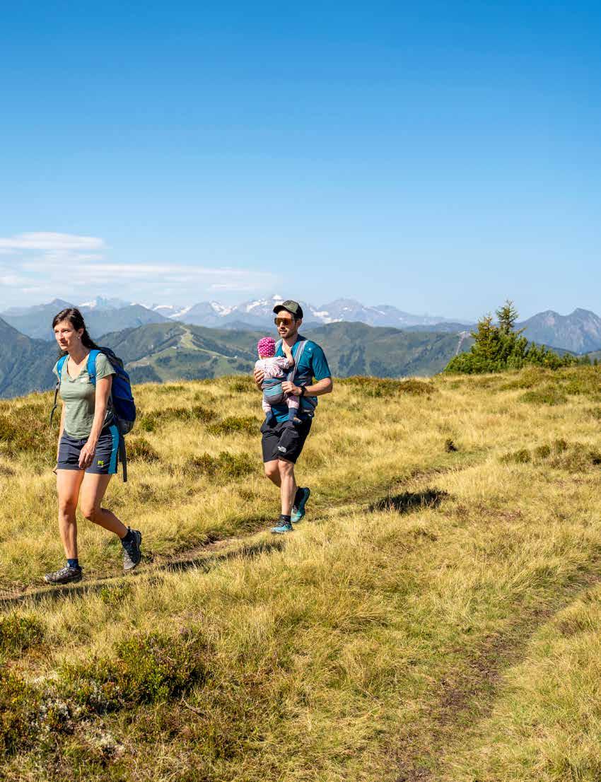 Weit gehen, weit blicken Über dem Ellmautal geht es gemütlich dahin. Der Großarler Thomas Wirnsperger begleitet die Autorin mit Freund Andreas und ihrer kleinen Tochter über das Hochplateau Richtung Trögseen. Von hier aus reicht der Blick weit über das Skigebiet Großarl hinaus – dahinter erkennt man sogar das Wiesbachhorn und den Großglockner.