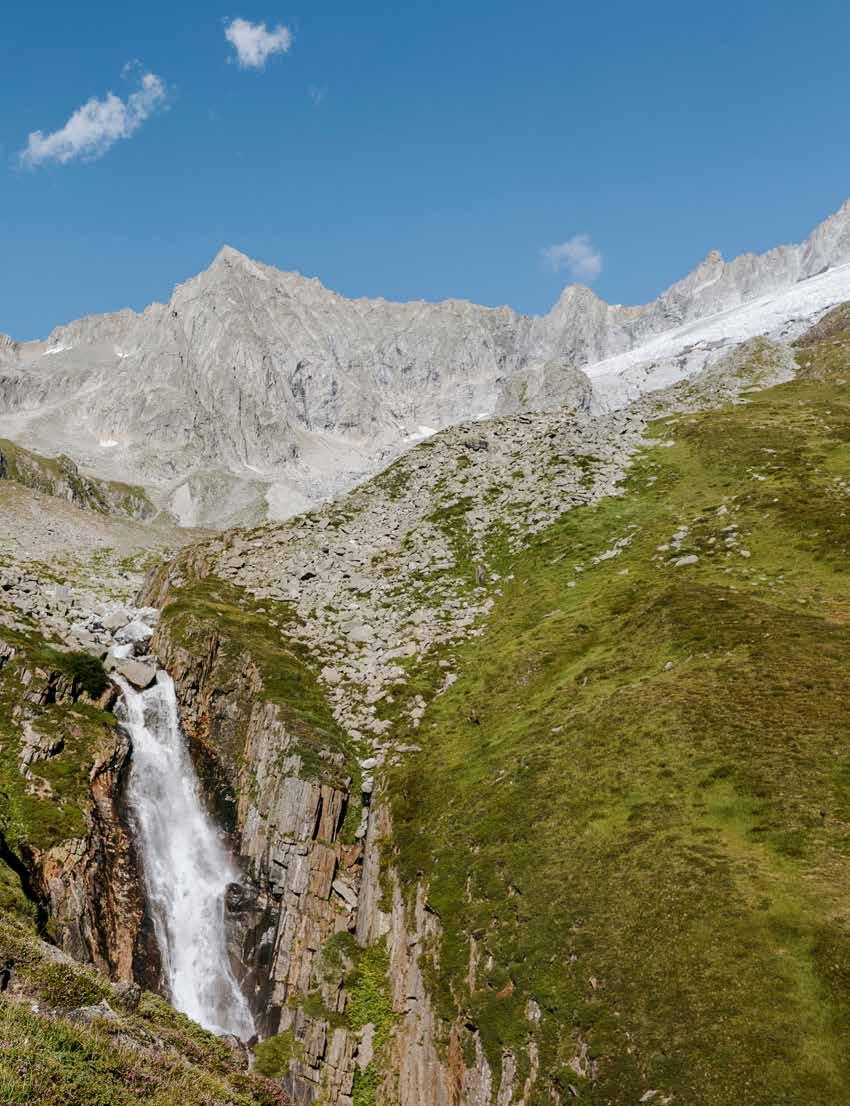 Das Furtschaglhaus liegt auf 2.295 Metern. Rundherum erheben sich die Gipfel, wie etwa die Furtschaglspitze (3.190 m) in der Bildmitte, als Bonus stürzt ein Wasserfall talwärts. Die Autorin und ihr Mann Rainer drehen noch eine Runde, bevor es zum Abendessen geht.