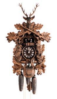 Original Schwarzwälder Kuckucksuhr mit geschnitztem Jagdmotiv und Acht-Tage-Uhrwerk.