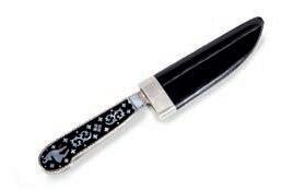 Ehrmesser mit Intarsien Traditionelles Ehrmesser aus Stahl mit Einlegearbeiten aus Perlmutt und Beschlagteilen aus Silber. Aus der Werkstatt von Peter Pfaffinger im Chiemgau. Maße: 21,5 cm, € 449,–