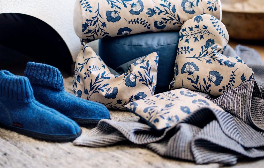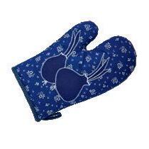 Der Kochhandschuh wird aus mit Blaudruck verzierter Baumwolle von der Blaudruckerei Koó genäht.
